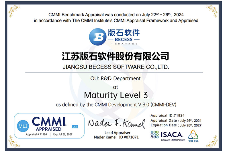热烈祝贺版石软件通过CMMI-3国际软件能力成熟度模型评估,荣获CMMI3级证书!这一殊荣不仅是对公司长期以来卓越努力与不懈追求的高度认可,更是公司实力与品质在行业领域内璀璨夺目的见证。它标志着公司在技术创新、服务水平或管理效能等方面达到了新的高度,树立了行业标杆,赢得了市场与客户的广泛赞誉。